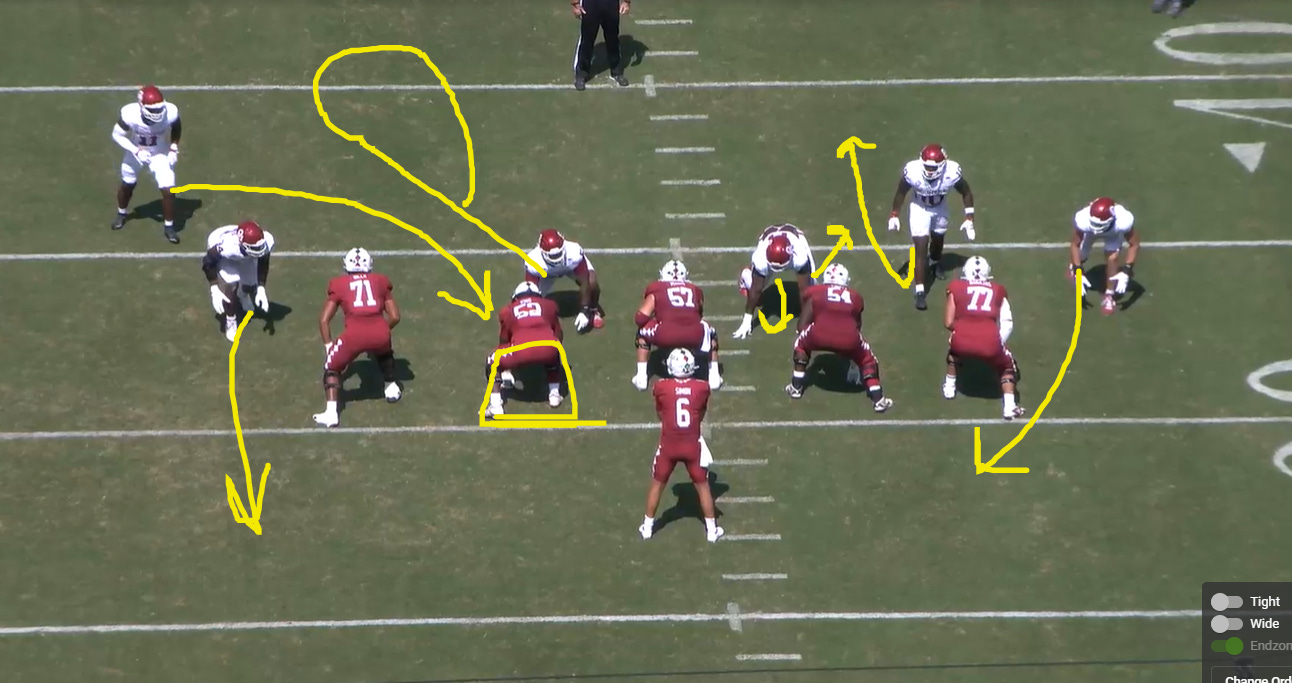 Creepers and Sims are replacement pressures. Generally, four man pressures but defensive coordinators are mixing in many different looks. These became all the rage with modern RPO spread taking over college football. A backer or nickel inserts and a lineman drops, so you still have seven in coverage. They are great on early downs against RPO teams because you stress protection without giving up the back end. This is considered “safe” pressure.
