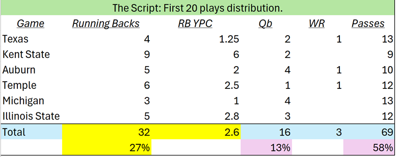 âIn the first 20 scripted plays of each game, 58% have been passes. Youâre opening searching for the chunk throws instead of setting tone with the run game. Thatâs impatience â thatâs a young OC chasing fireworks instead of foundation.â