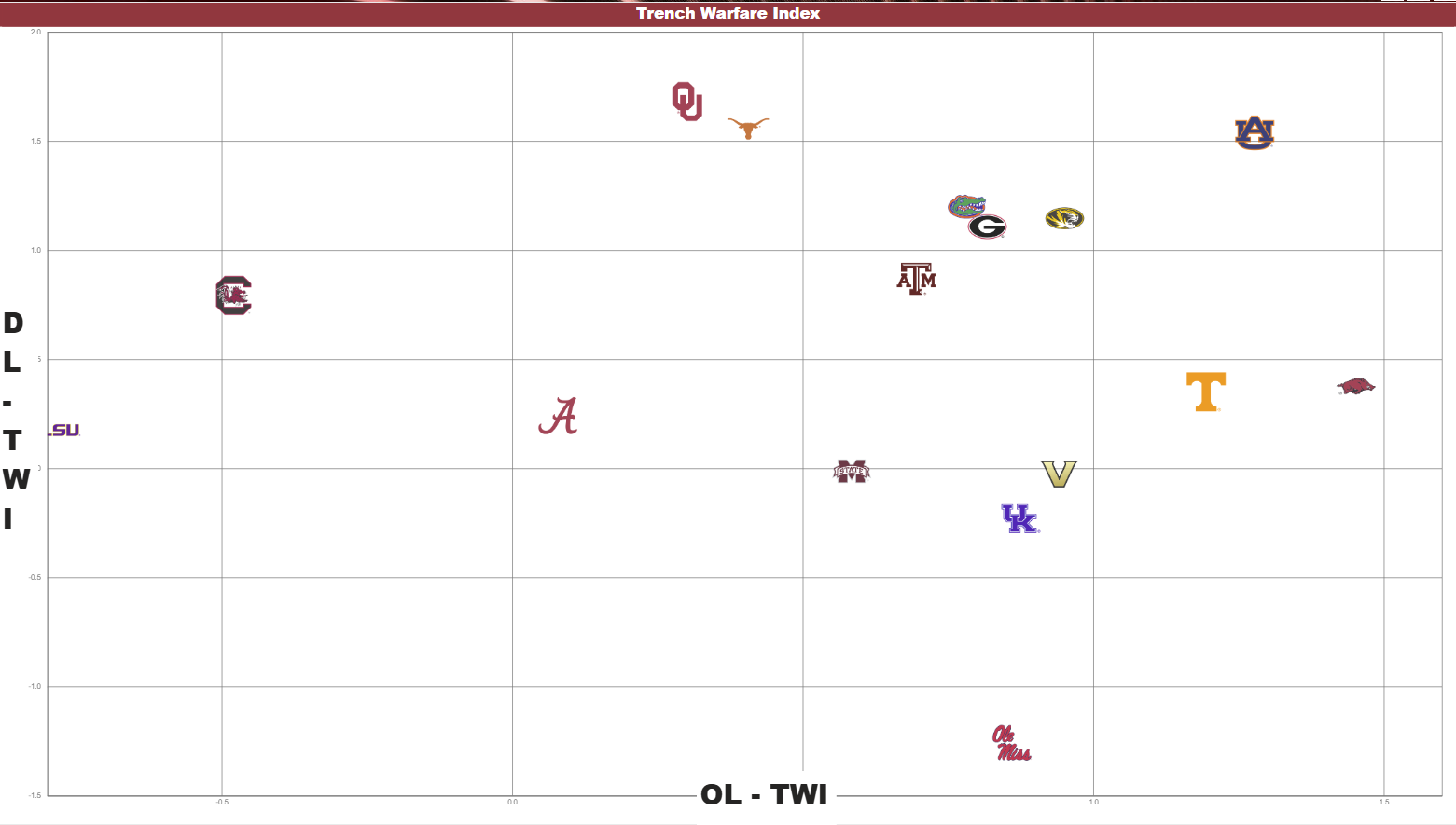 The scatter is O-TWI vs D-TWI . OU is higher on because its DL is best in the SEC. Auburn’s combined can edge OU because both of Auburn’s units grade strong (O ≈1.28 and D ≈1.54), while OU is great on D but only okay on O. A weighted combined score rewards Auburn’s balance.